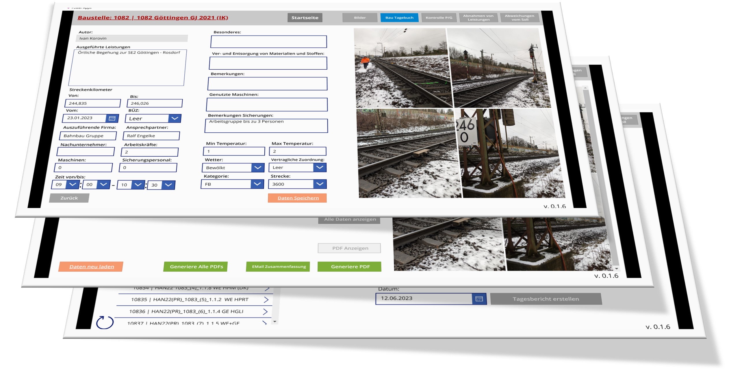 In der „Anleitung zum Anlegen und Führen des Bautagebuches 809.0301Z01“ sind die Spalten eines Bautagebuches definiert. Unsere Anwendung richtet sich exakt nach diesen Vorgaben, sodass eine vollständige, zeitnahe und lückenlose Dokumentation, wie in der RIL 806 gefordert, ermöglicht wird. Zusätzlich beinhaltet unsere Anwendung Module, wie zum Beispiel „Bilder“, um weitere vertraglich geschuldete Dokumentationen durchführen zu können.